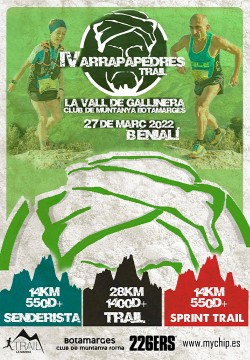 El pasado Domingo 27 de Marzo tuvo lugar la cuarta edición del trail arrapapedres en la localidad alicantina de Benialí, carrera organizada por el Club de Muntanya Botamarges. La carrera constaba de dos pruebas de trail, una de 14 kilómetros y 550 metros positivos en donde 186 participantes tomaron la salida y otra de 28 kilómetros, en donde 170 participantes tomaron la salida, y de una prueba senderista, que contó con algo más de 80 participantes, que compartía recorrido con el trail de 14 kilómetros.