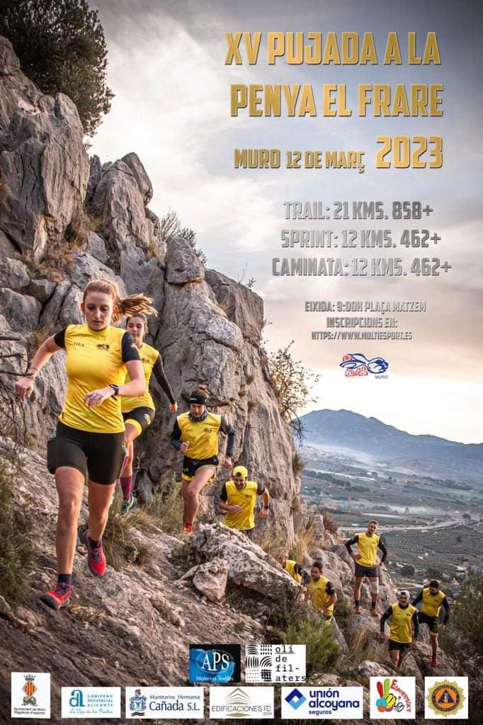 El pasado domingo día 12 de marzo tuvo lugar en Muro de Alcoy la XV edición de la prueba de montaña Pujada a la Penya el Frare, organizada y coordinada por el Club de Deportes de Montaña Les Llebres de Muro, con la colaboración de del Ayuntamiento de Muro de Alcoy. La prueba consta de tres modalidades, un trail de 22 kilómetros, un Sprint trail de 12 kilómetros y una marcha senderista.