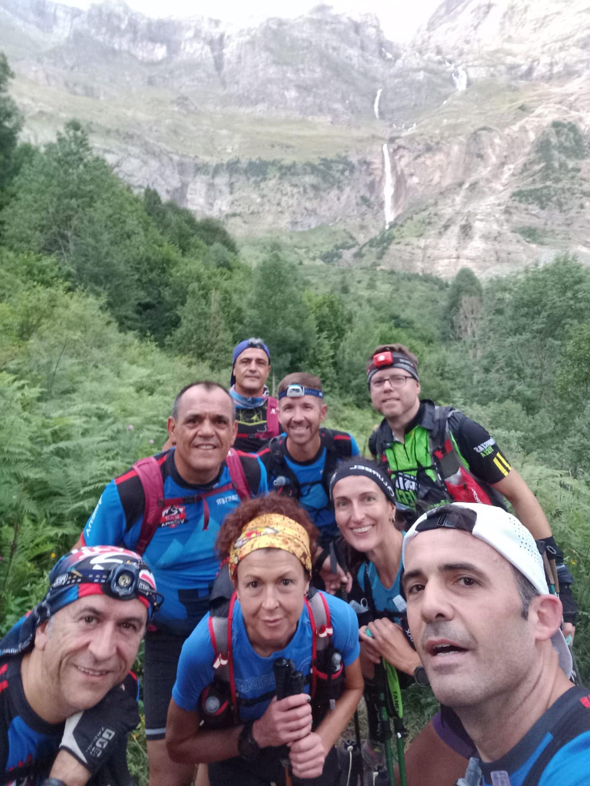 Salida puntual a las 5:00h de la madrugada del sábado desde el parking de Pineta, apenas habíamos subido 200 metros positivos en 2,5 kms, y nos vemos el puente que cruza la cascada para empezar la dura subida al Balcón de Pineta destruido por una crecida de agua en días anteriores, nadie nos había dicho nada, tocaba volver de donde habíamos salido y empezar desde cero de nuevo, cruzando la cascada desde un puente más abajo que va a la Ermita de Pineta y subir por una senda muy empinada a buscar de nuevo la otra parte del puente roto, la primera en la frente.