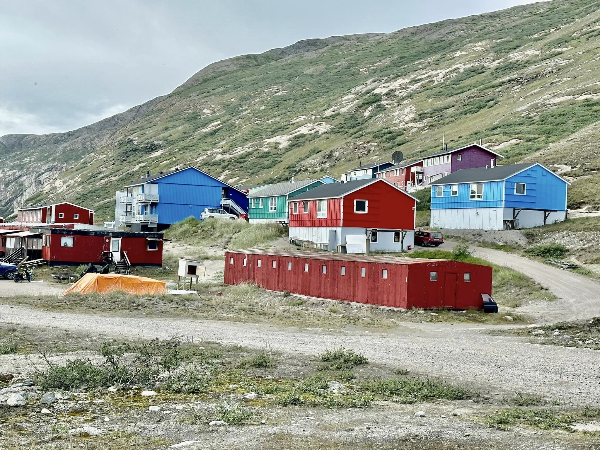 En salir del refugio vadeo de río y prosigo encontrando varios senderistas que llevaban mochilas que creo que entraría todo lo que tengo en mi armario, siempre pare para intercambiar 4 palabras con mi fluido inglés (como ya lo saben), aparece el otro refugio (Nerumag 19 km mas). Estoy eufórico , el tiempo está nublado con amenazas pero no llueve, cruzo una zona de agua estancadas, no hay viento donde aparecen los famosos mosquitos, impresionantes los que hay, una nube. Otro refugio (1st Fjord 17 km más), a este refugio no entre porque estaba a 300 mts y me parecía mucha distancia (Jajaja), otro más (Skilift 23 km) estaba cerrado… me favorece, oscurece a las 23 horas… me queda tiempo, empiezo a bajar por una senda “como no“ mojada y con agua, al FINAL veo Sisimuat, PUFF!!!!