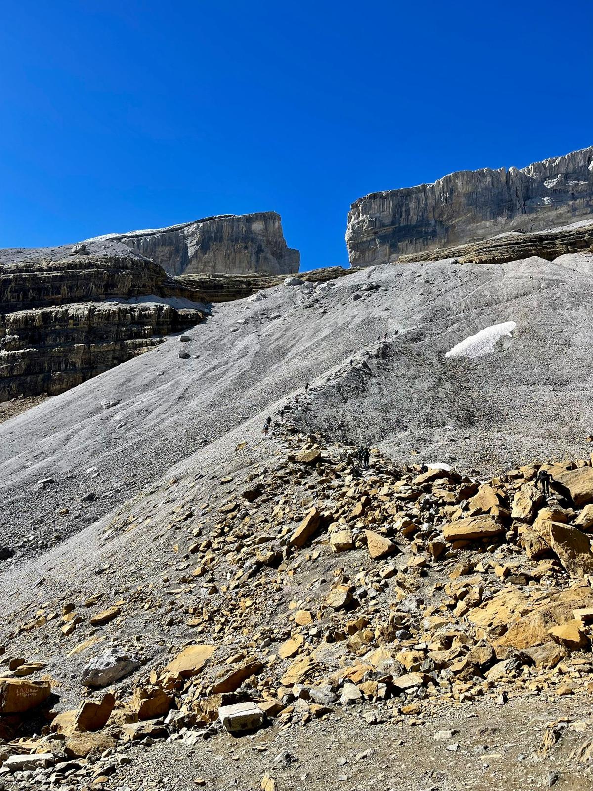 Llegamos al Refugio de Góriz, en donde descansamos sin prisas y disfrutamos del lugar, charlando un rato, desde el Refugio de Góriz se puede salir corriendo, por terreno fácil y horizontal, en suave subida, durante 1,6 kilómetros con vistas al Cañón de Ordesa, a nuestra derecha, las rampas finales al Cuello superior de Góriz (2.340m) se inclinan más y volvemos a sacar los bastones. Giramos a la izquierda, siempre siguiendo las marcas blancas y rojas de la GR-11, viene ahora un tramo de un kilometro en subida suave y moderada, desde los 2.340 m hasta los 2483 m, donde cruzamos un arroyo, es el último punto para poder coger agua en mucho rato, con lo que conviene aprovecharlo, cerca del km 33.