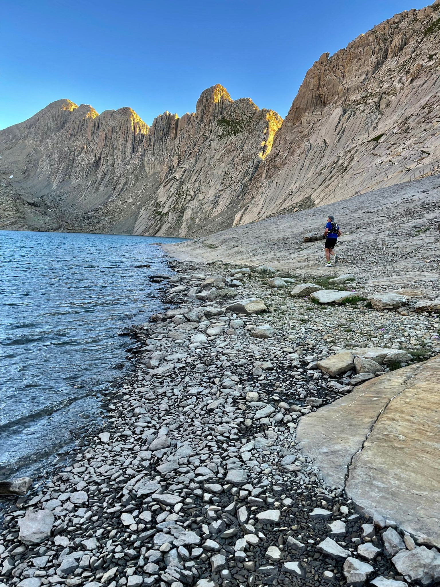 Subida de las largas, hasta el Balcón de Pineta (2.507 mts), de esas eternas pero que todavía te pilla con las pilas cargadas, poco a poco amanece y apagamos los frontales y se intuye que el día va a ser de los calurosos, alcanzado el Balcón de Pineta y tras las fotos de rigor, buscamos el lago Marboré, el cual bordeamos hasta la canal que nos lleva al refugio de Tucarroya (2.662 mts), pequeño y que nos asombro que estuviera cerrado, aquí llegamos a uno de los puntos mas conflictivos de la ruta, estamos en alta montaña y esta bajada es la peor que puedas imaginar, vertical y resbaladiza y con mucho peligro, nos costó lo nuestro descender los primeros cientos de metros porque había piedra suelta con restos de barro que la hacia mas complicada, pero todo pasa, bajamos hasta llegar al Collado del Bourne de Tucarroya (2.436 m), desde allí la ruta es menos vertical, conviene seguir los mojones y seguir bajando hacia el norte (en lugar de hacer media ladera como cuando vamos con esquís) pues hay que bajar hacia el norte hasta la cota 2.300 m, donde llegas a unas bellas praderas donde la senda permite correr muy bien, por terreno muy llano y muy agradable.