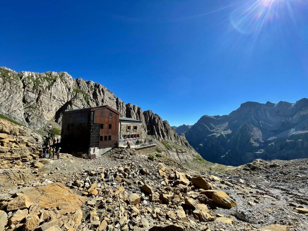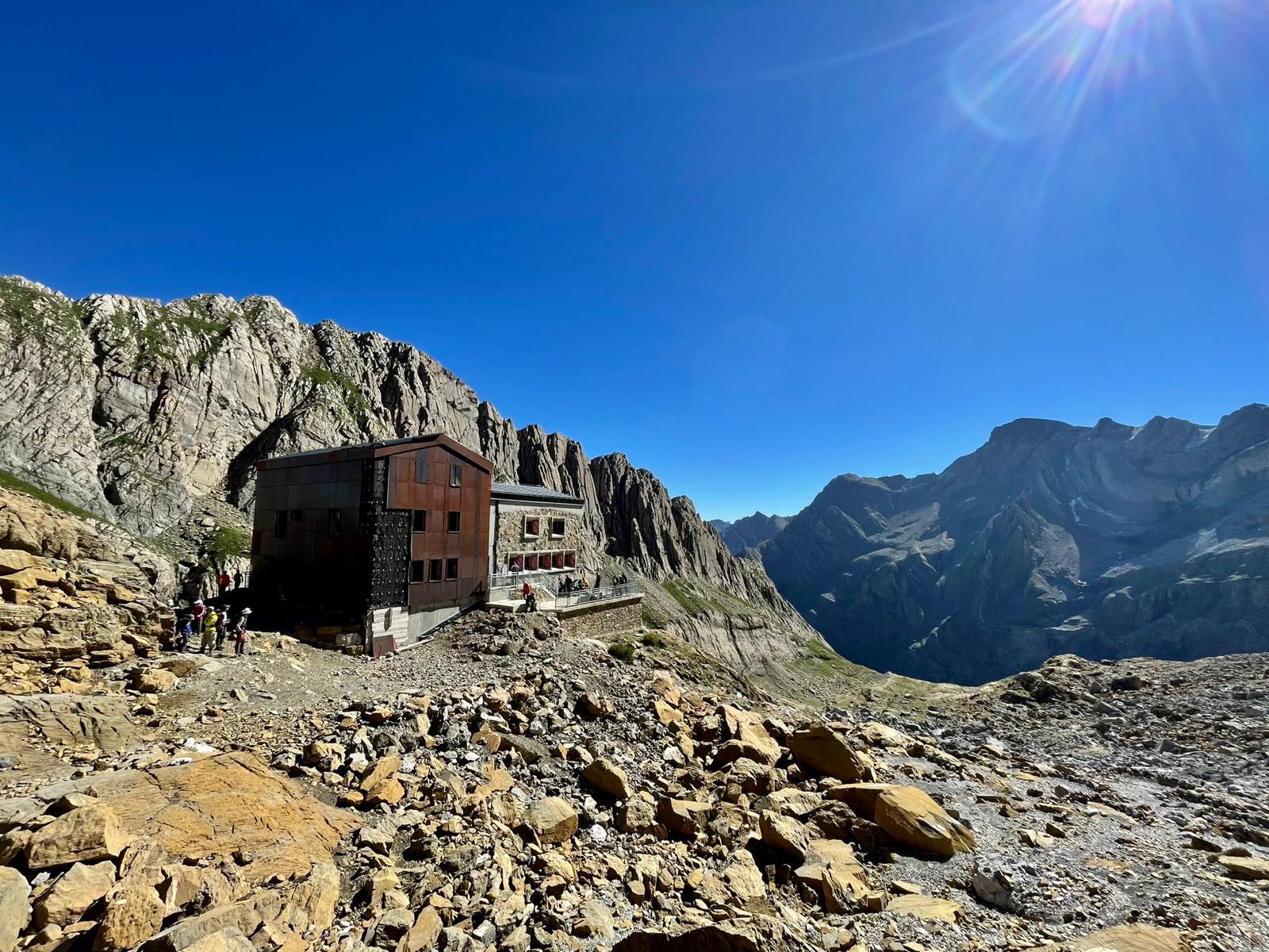 Desde las cotas 2.100 y 2.300 metros la senda sube, todavía algo inclinada, finalmente, en la cota 2.300 la pendiente se suaviza y ya ves al fondo el Refugio de Sarradets o Refugio de la Brecha de Rolando, en este punto Miguel Flor y Sebas no se encuentran bien, ya vienen tocados desde la subida del Circo de Gavarnie y deciden dejarlo, no sin antes bajar tres horas más hasta el Camping de Bujaruelo, Francisco Pardo les acompañó para hacerles compañía en un gran gesto de solidaridad.