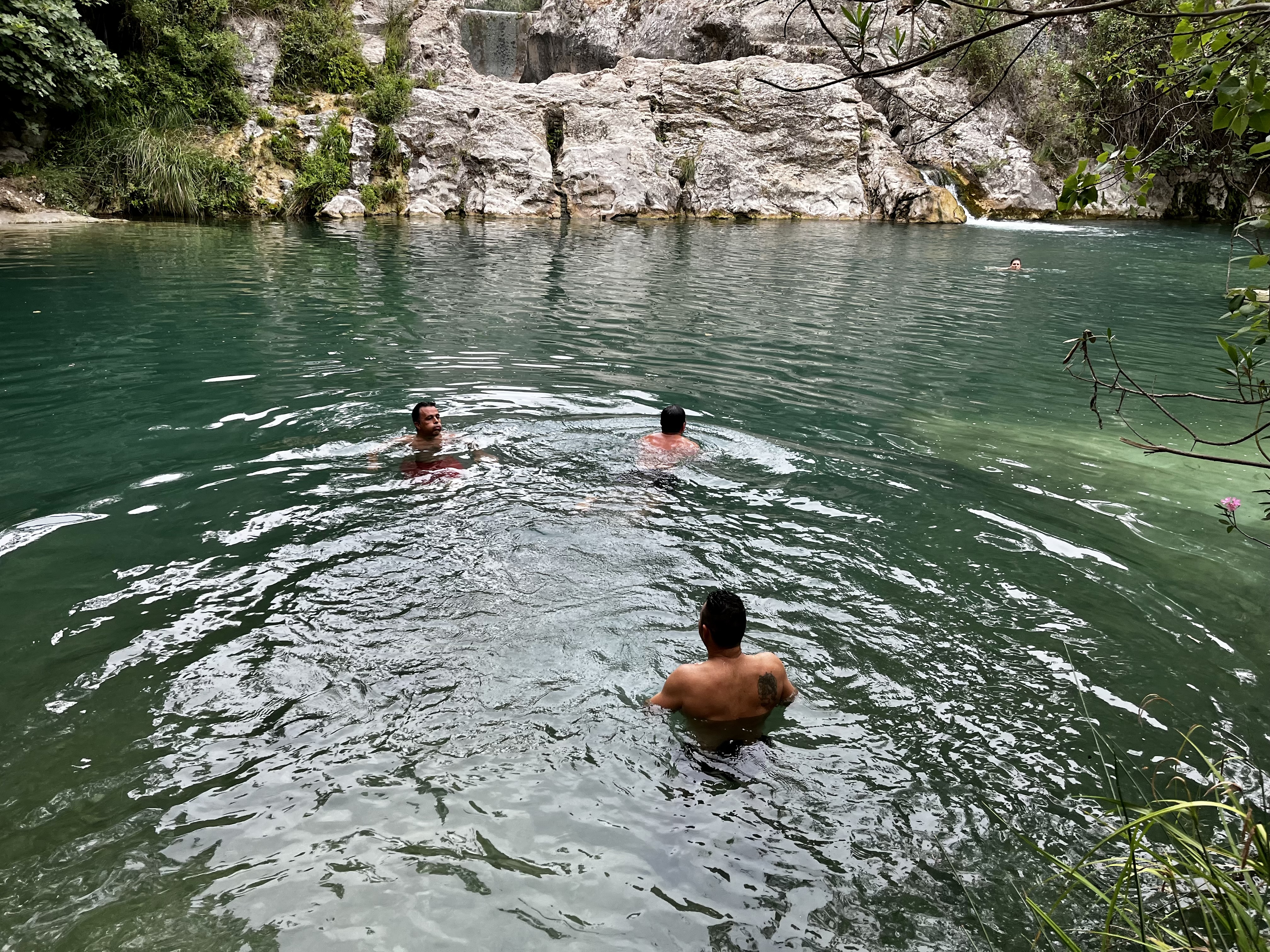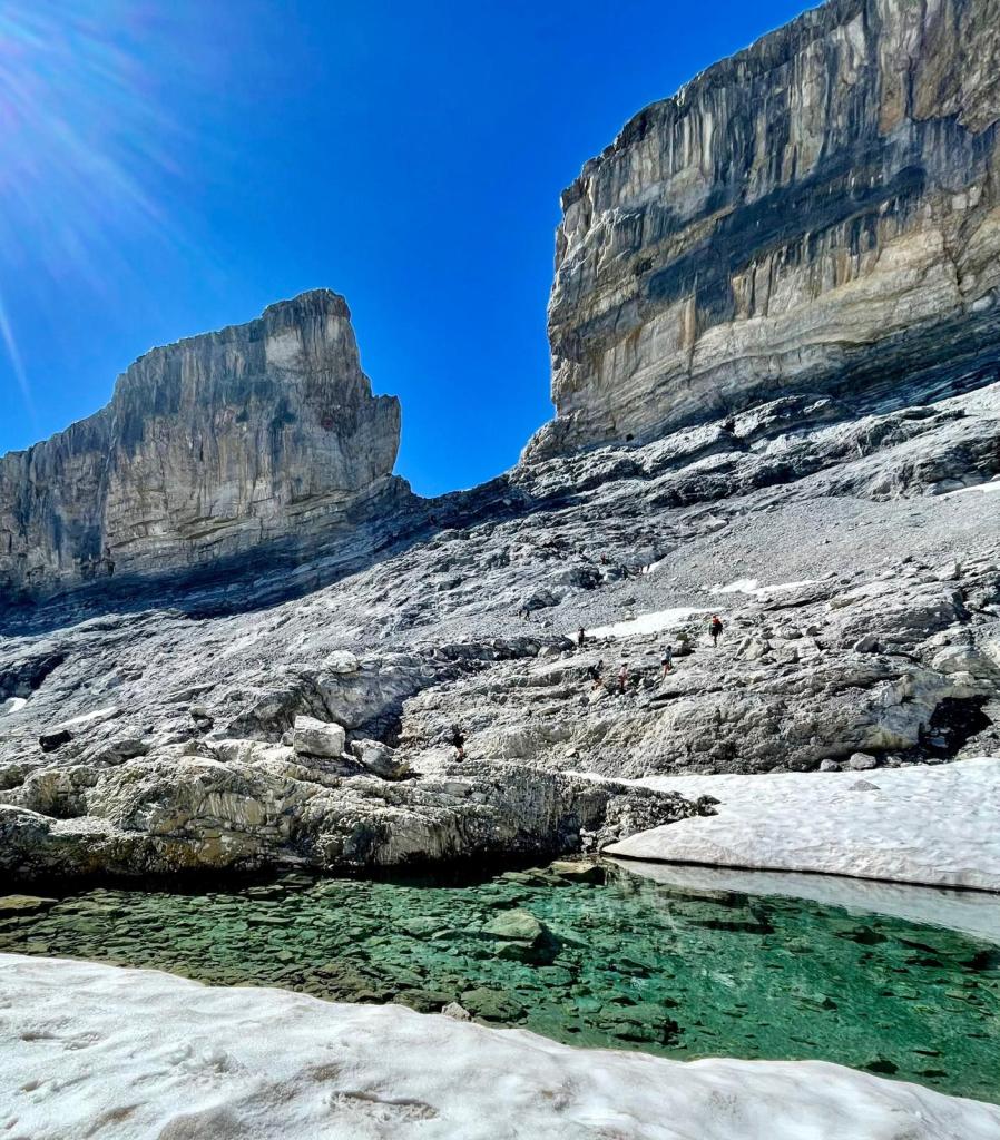 Seguimos por la senda, que se adentra hacia la gran cascada de Gavarnie (la cascada más grande y alta de Europa), y aprovechamos para hacer más fotos y darnos un refrescante respiro, algunos hasta se bañan, poco después dejamos la senda principal, que lleva a los turistas a la gran cascada del fondo, y tomamos el desvío a la derecha que baja a cruzar el río por un puente, que también está roto pero podemos saltar entre las piedras para cruzar la cascada, luego seguimos por el fondo del circo, hacia el sur, para posteriormente ir desviándonos a la derecha, a buscar la entrada al paso de Les Echelles.