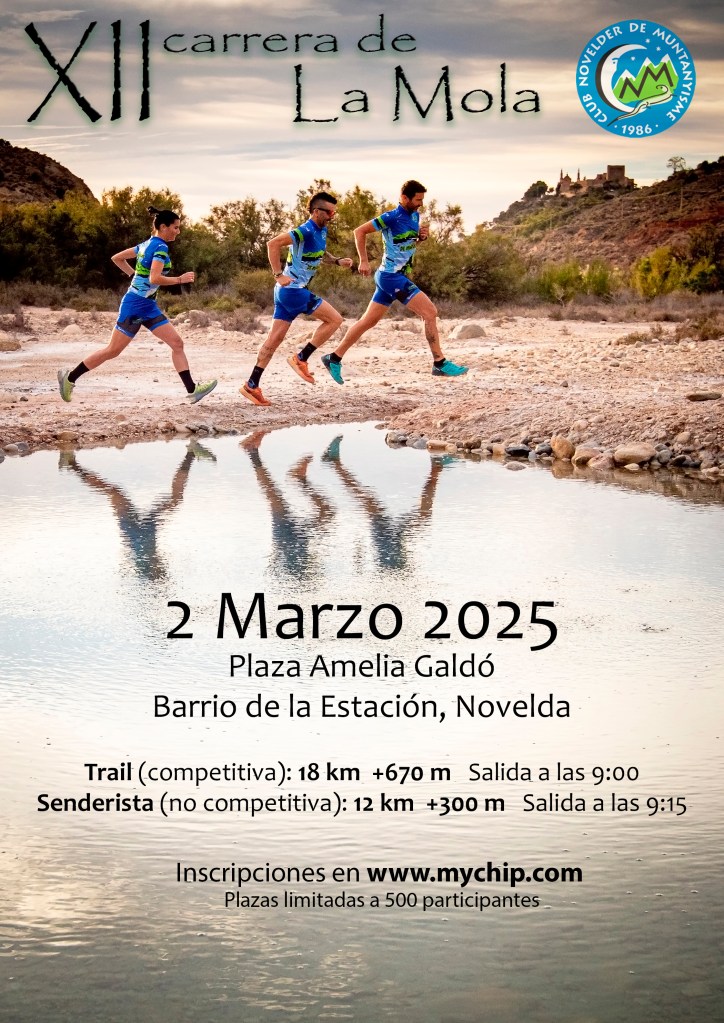 El pasado domingo día 2 de Marzo, tuvo lugar en la localidad de Novelda (Alicante) la XII edición de la popular Carrera de la Mola, la prueba, que daba comienzo a las 9:00 horas, en una más que fría mañana invernal, salía desde el barrio de La Estación y recorría 18 kilómetros con un desnivel de 670 metros positivos, complementada con una marcha senderista no competitiva que salía minutos después de un total de 12 kilómetros, la prueba cruzaba las vías del tren y de servicio de la autovía hasta enlazar con el camino rural bajo el puente del AVE, continuando por los parajes de Monteagudo, Salinetas, cauce del río Vinalopó y finalmente el Cerro de la Mola hasta llegar a la Plaza Amelia Galdós.