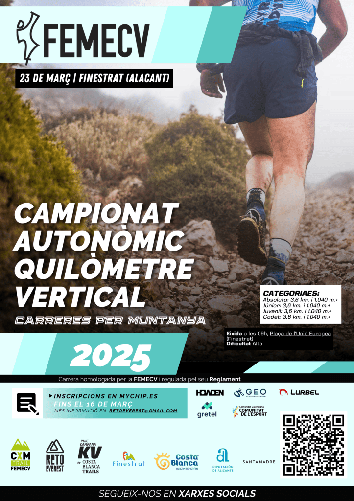 El pasado domingo 23 de marzo de 2025 sobre un recorrido de 3,6 kilómetros y 1040 metros de ascensión hasta la conocida cima del Puig Campana (1406 m.s.n.m.) tuvo lugar el Campeonato Autonómico de Kilómetro Vertical organizado por la FEMECV con salida en la localidad alicantina de Finestrat.