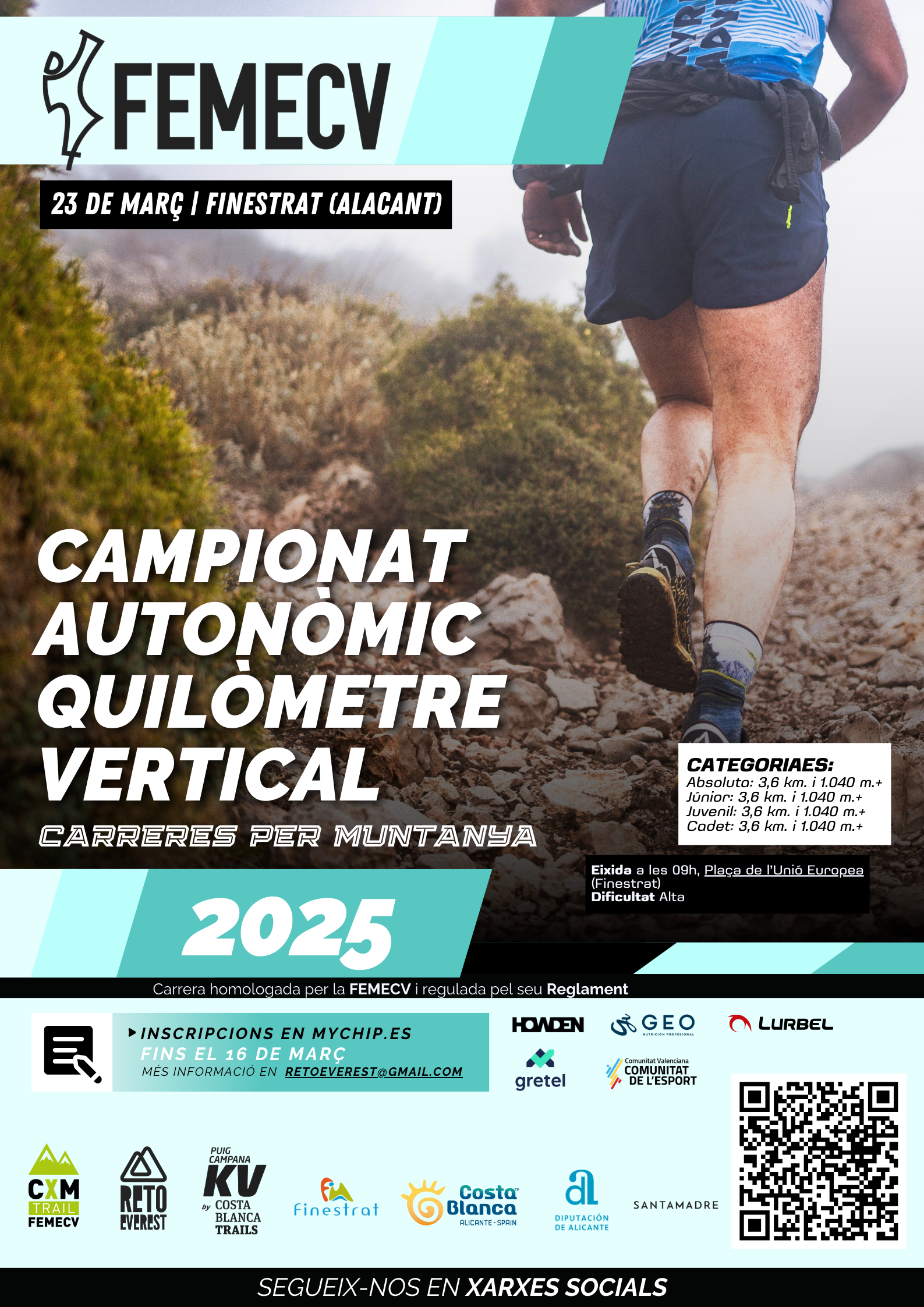 El pasado domingo 23 de marzo de 2025 sobre un recorrido de 3,6 kilómetros y 1040 metros de ascensión hasta la conocida cima del Puig Campana (1406 m.s.n.m.) tuvo lugar el Campeonato Autonómico de Kilómetro Vertical organizado por la FEMECV con salida en la localidad alicantina de Finestrat.